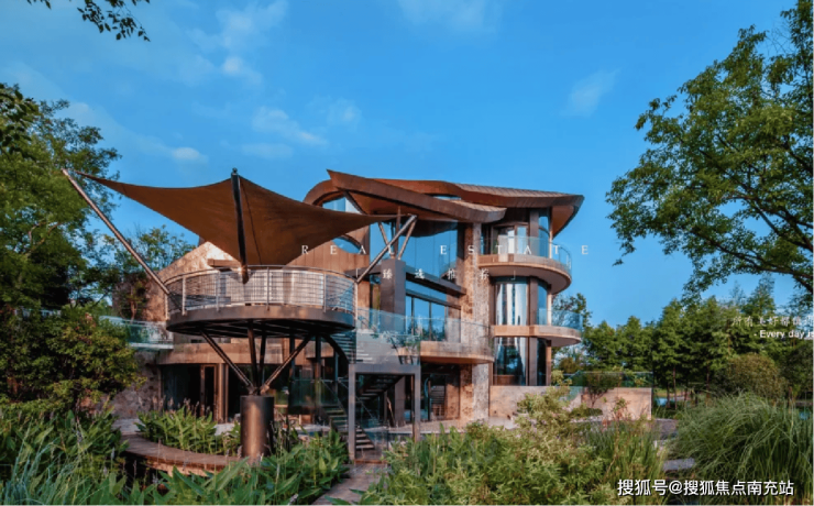 每幢房子都临湖,建筑几乎没有垂直线,大量流畅的曲线、夸张的斜线,分割出不同的异形空间,别墅每幢房子都配置私家码头,创造出神秘的融合空间并将其延展到室外。