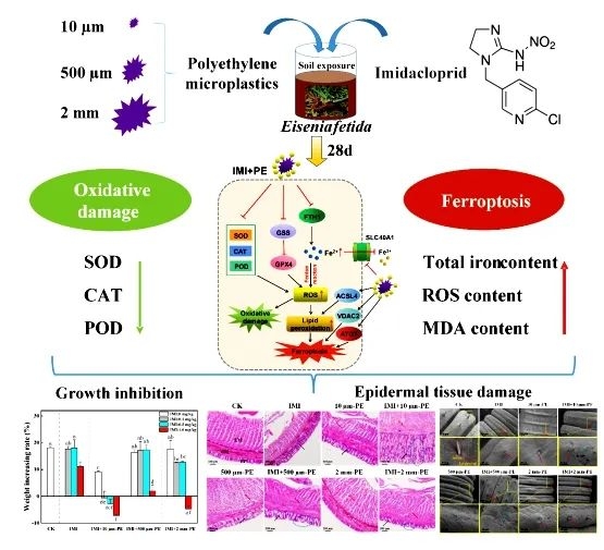 结果表明,与单独暴露相比,二者复合污染对蚯蚓产生更显著的毒性效应,导致蚯蚓体重降低、产生严重的表皮损伤和氧化损伤,并激活铁死亡通路;这种复合毒性效应与微塑料在土壤中分布尺寸相关,小尺寸的复合污染暴露导致更强的毒性效应。